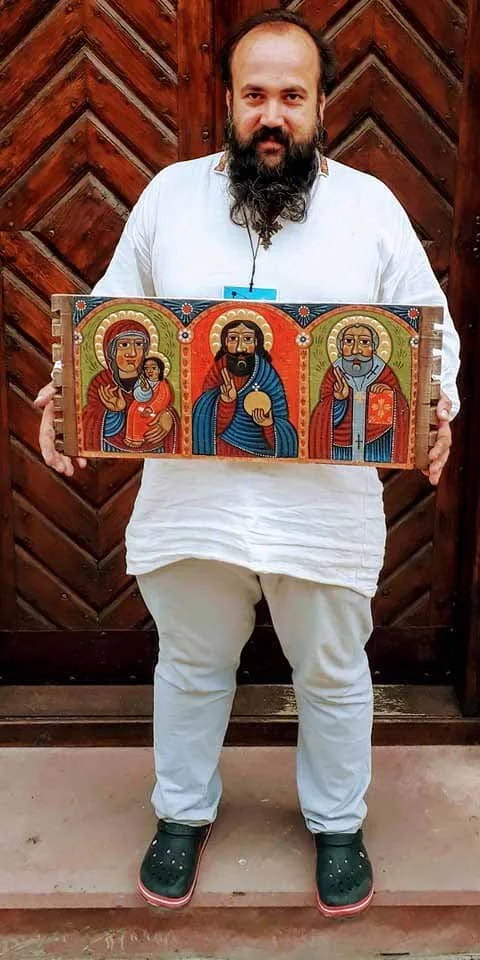 Roman is the head of the Exhibition and Education department at the National Museum in Kyiv, which houses the largest collection of Ukrainian icons in Europe. Through this, he has had the opportunity to closely study traditional folk icons. He uses traditional materials of wood, canvas, gesso, and gilding to create his icons, noting the only modern exception is readily-available acrylic paint. “I try to use the traditional iconography that was characteristic for the Ukrainian folk art in the Carpathian region, but I enrich it with new details, expanding the repertoire of the themes and compositions that were not previously encountered here but are relevant now,” he explains. Another tradition in folk art icon painting is to include family in the work, and Roman is proud to work with his wife and daughters.