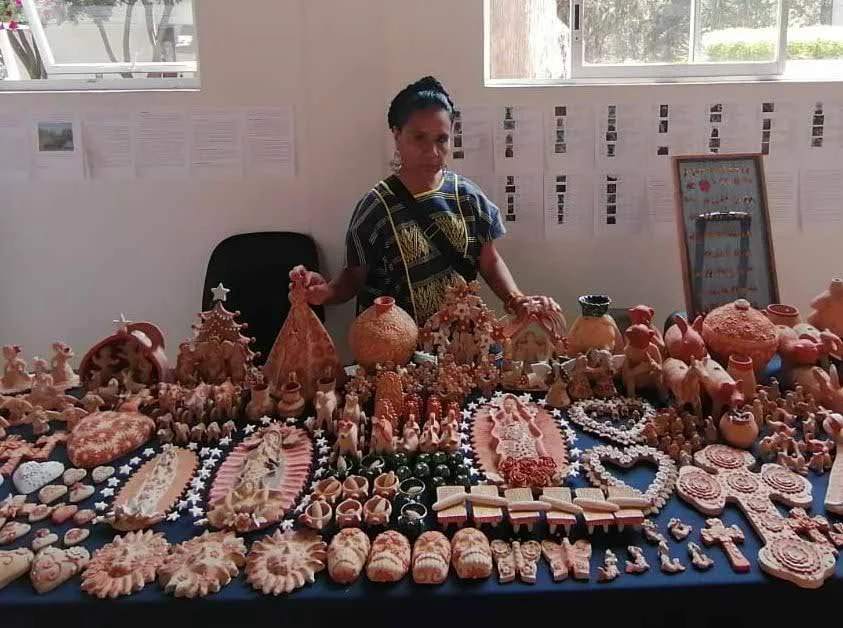 Enedina’s sculptures are small but complex, replete with imagery derived from her indigenous Zapotec heritage. Like her father, she has mastered the skill of pastillage – ornamentation of clay sculptures and vessels through the surface-application of separately-modeled adornments. Her subjects include traditional Hispanic Catholic motifs such as the Virgin of Guadalupe, the Virgin of Solitude, nativity scenes, sacred hearts, and crosses, as well as small sculptures of farm animals, tiny cooking implements, and traditional Mexican Tehuana dolls. They burst with clusters of stars, roses, lilies, and sunflowers, rendered in ancient earthen colors that harken back to Mexico’s pre-Hispanic past.