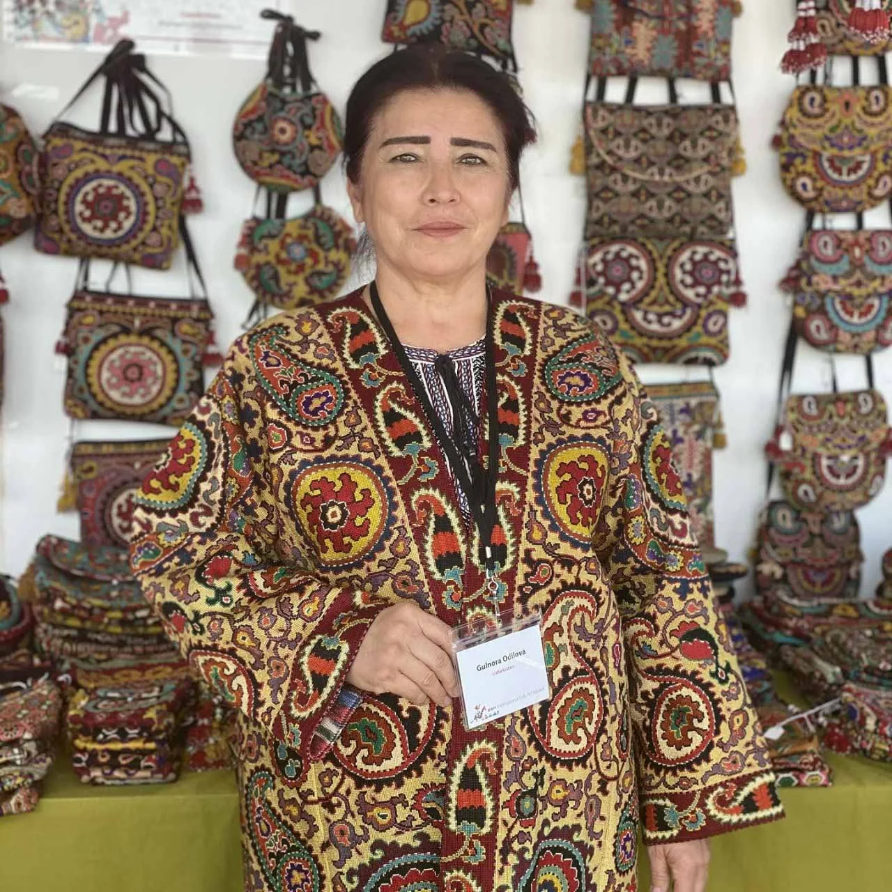 Gulnora Odilova resides in the city of Shakhrisabz, located in southern Uzbekistan. Over a decades-long career as a master beadworker, weaver, and embroiderer, Odilova has also taught her skills to hundreds of artisans, the vast majority of whom are women. For years, Odilova’s mission has been to preserve and revive traditional Shakhrisabz embroidery, while simultaneously promoting it to an international audience.