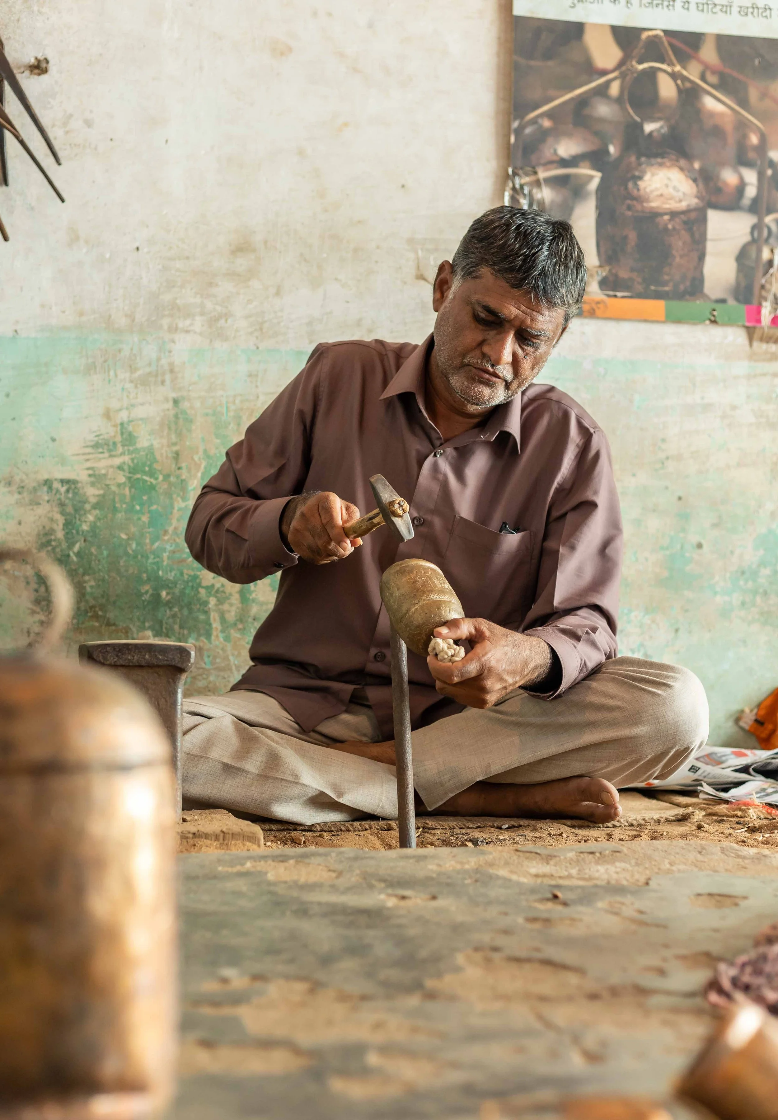 Luhar estimates that his family has been involved in bell making for more than three centuries. He first learned the craft from his father and by the time he was 18, he started managing the family business. Copper bell-making requires attention to detail at each step in order to achieve the beauty of sound and appearance so prized in the tradition. Janmamad’s ability to tune his bells is a skill he considers a gift from God.