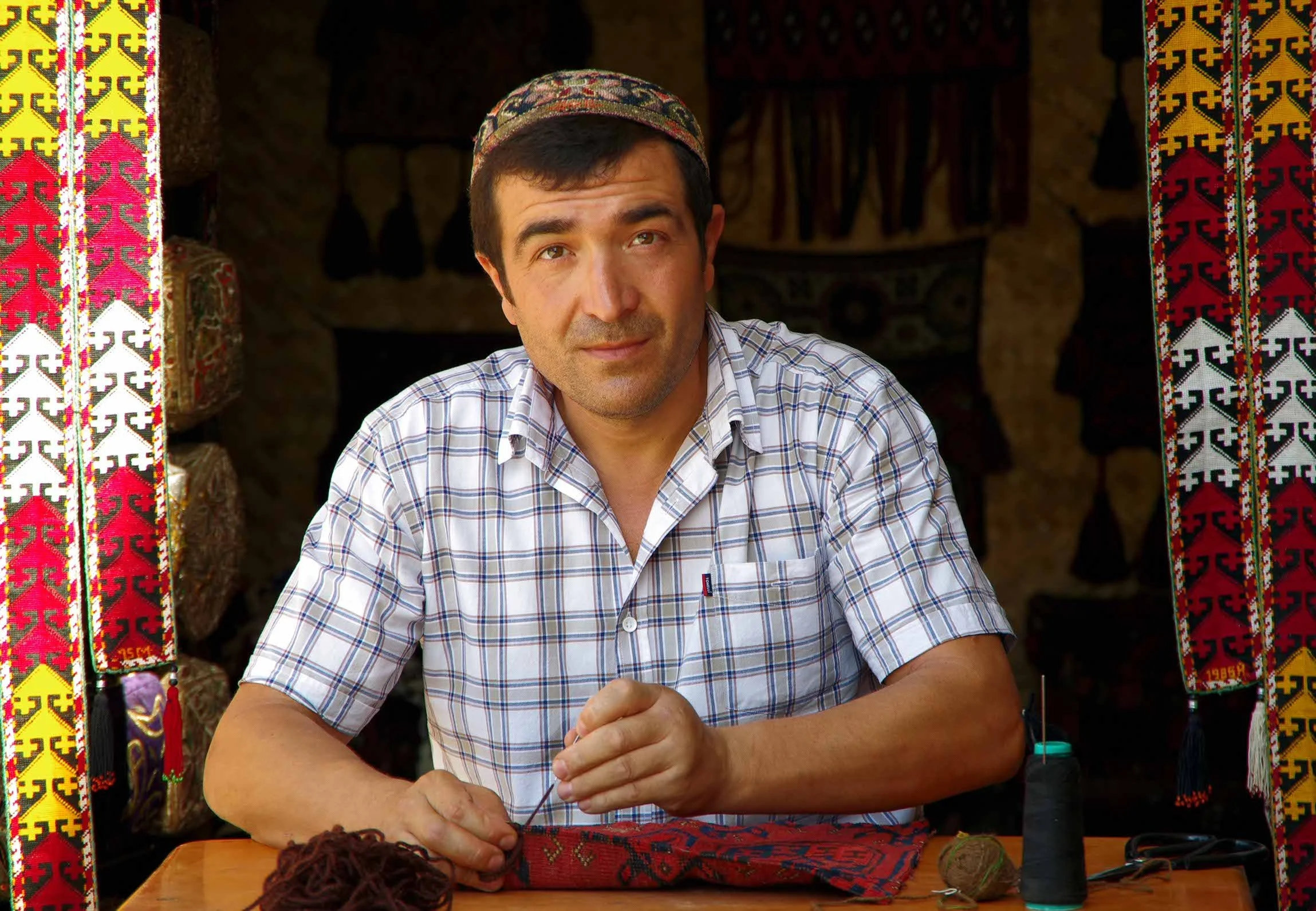 Djamol Temirov is one of the many artisans who works out of the Trading Domes, which he describes as a place to leave the hustle and bustle of the city behind and enter an environment where traditions are honored and respected. Djamol has been running a small business there amongst his fellow craftsmen since 2000. His trade is unique in that he restores old wool carpets through the creation of new artistic pieces. He began his practice two decades ago when he purchased a carpet from a second-hand retailer to repurpose as a customized bag. Pleased with the results and inspired by historical research, Djamol continues working in this vein, repairing old rugs and granting them a second life and purpose. The results are intriguing, collaged tapestries in vivid scarlets and deep indigos that recall traditional craft through the creation of the new.