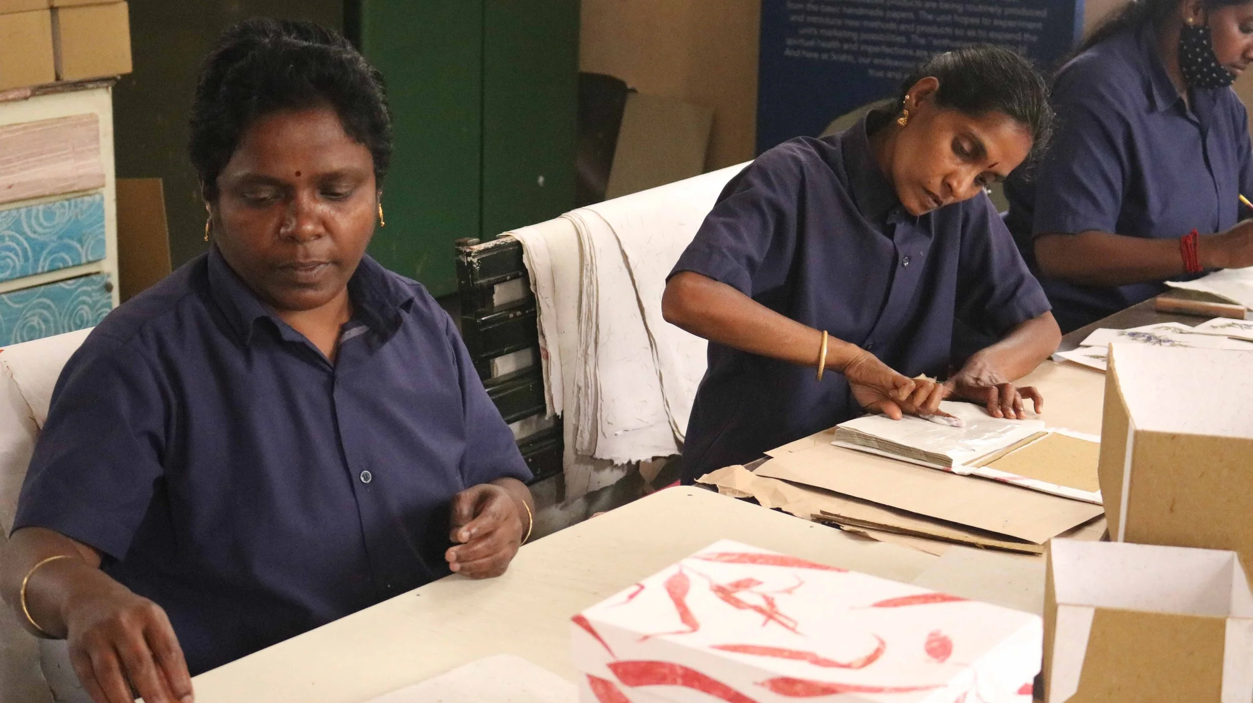 Utilizing recycled cotton, banana fiber, wild grasses, tea waste, or elephant dung, Athulya Paper Studio by Srishti Trust in Munnar, Kerala, India creates a wide variety of handcrafted, 100% wood-free paper products. Additionally, the studio was initiated by the Srishti Trust in order to provide a safe haven and economic opportunity for specially-abled children and adults of the community of plantation workers in Munnar, Kerala. Today it is run by nearly forty specially-abled artisans.