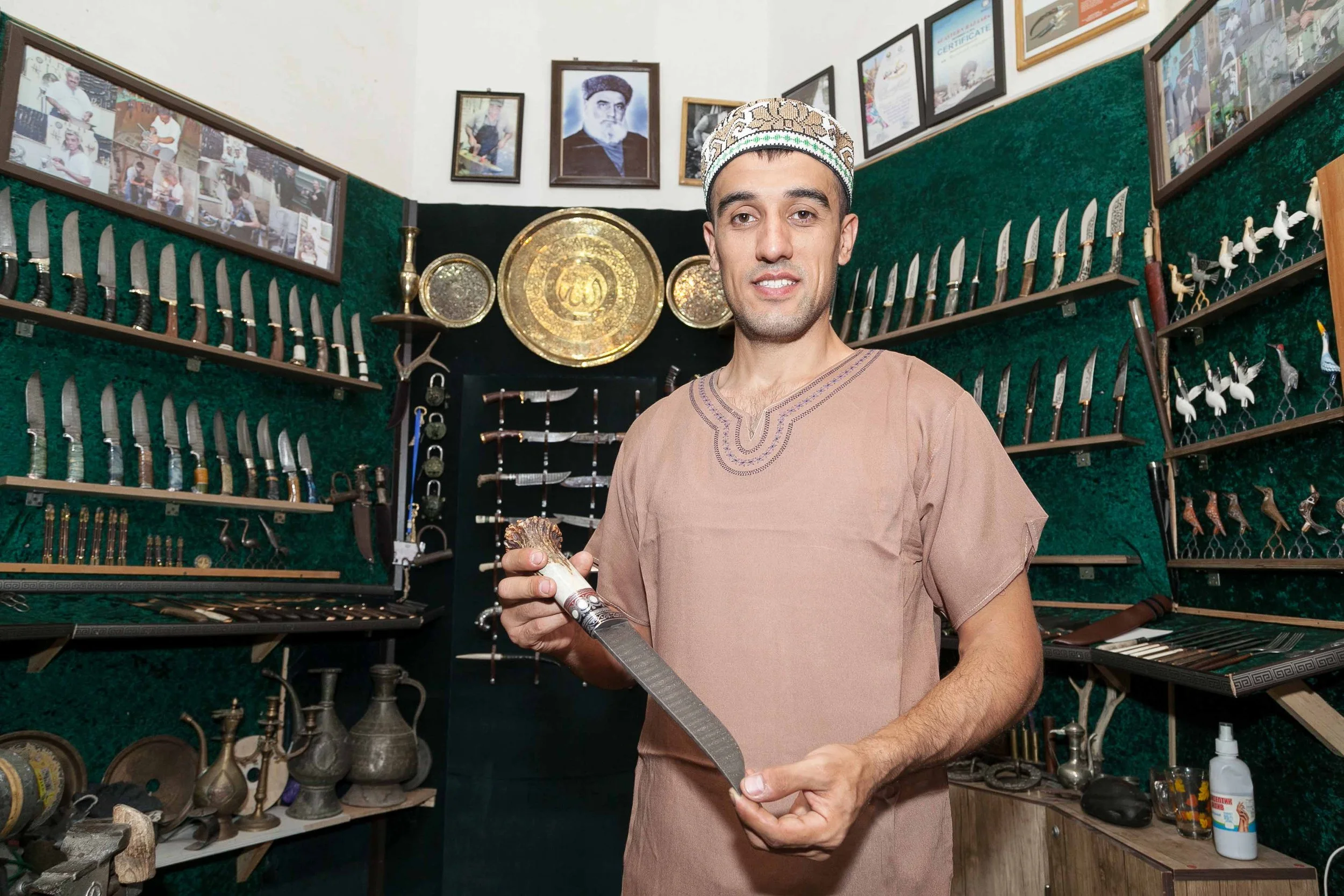 Shukurillo Kamalov is part of a talented family. He is a sixth-generation blacksmith and knife maker from the ancient city of Bukhara, Uzbekistan. The city was a center of scholarship, culture, trade, and craft along the Silk Road that boomed during the medieval period in Central Asia and remains a center of excellence in the arts. The Kamalov family has long been steeped in this creative and industrious culture, and male family members become familiar with blacksmithing at a young age. Shukurillo recalls listening to discussions of metallurgy and metalwork as a boy, watching his father forging in the family workshop after school, and being allowed to hold the finished pieces. Upon finishing school at age 16, he became his father’s forging partner, and they still work together today. He describes himself as a happy person, because he gets to do his “dream job,” continuing the traditions of his ancestors, while surrounded by his loved ones.